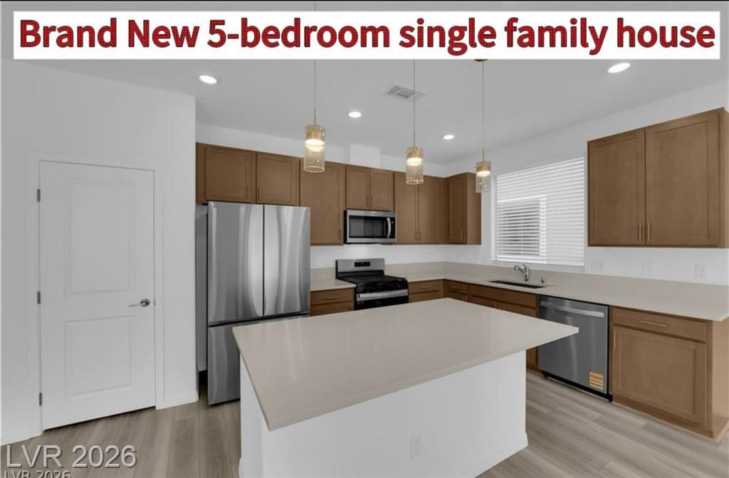 Brand New Home in the prime location of Vegas. Beautiful 2-story house 5-bedroom (1 bedroom with full bath downstairs), 3-bath home with a 2-car garage, located in Southwest Las Vegas. The open-concept living, dining, and kitchen areas feature a 9-foot ceiling, quartz countertops, stainless steel appliances, a pantry, and a large island ideal for entertaining. Window curtains & blinds throughout. Upstairs offers 4 additional bedrooms, including a spacious primary suite with a walk-in closet, dual sinks, and walk-in shower, plus a loft perfect for a home office or media space. Energy-efficient upgrades include Low-E windows, radiant barrier roof, and a tankless water heater. Enjoy a classic paver backyard (finished yard photo coming soon) for your family's outdoor entertainment. Conveniently located near I-15, Blue Diamond shopping and dining, schools, airport, Las Vegas Strip, and future high-speed rail.