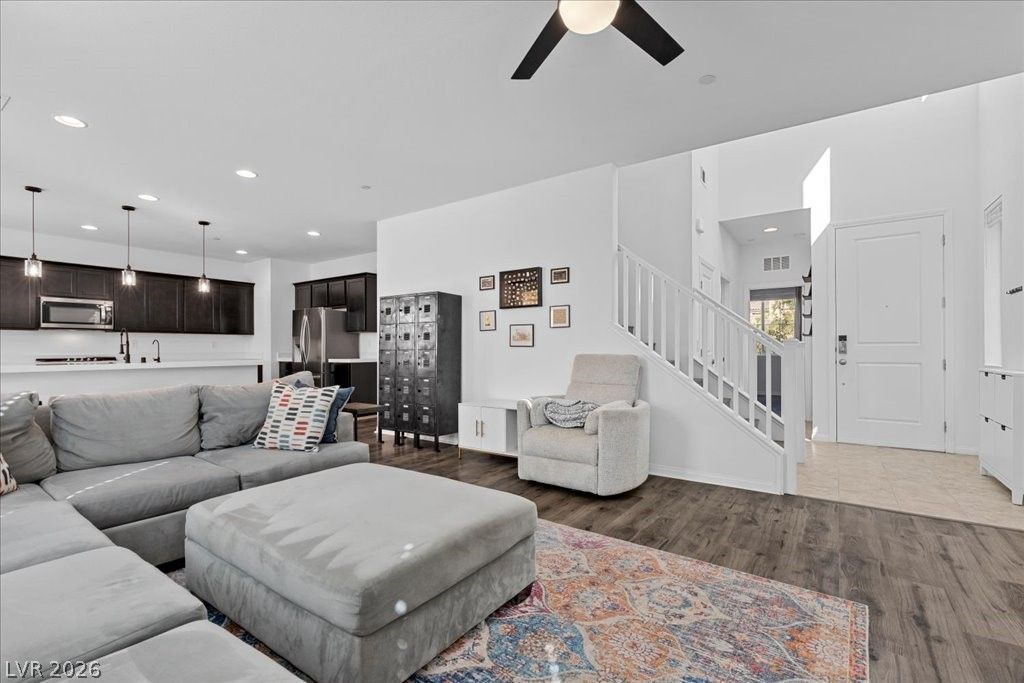 Welcome to 10399 Bagg Ave, where modern luxury meets effortless Las Vegas living in the heart of Skye Canyon. Surrounded by mountain views, scenic trails, and endless Nevada sunshine, this beautifully designed home offers style, comfort, and convenience. Inside, bright open-concept living spaces flow seamlessly from the chef-inspired kitchen into a sleek, inviting great room, perfect for entertaining or relaxing!! Thoughtful finishes include quartz countertops, designer lighting and bespoke appliances that create a fresh, elevated feel throughout. Upstairs, the spacious primary suite offers a spa-like retreat with an oversized walk-in shower and an impressive walk-in closet. The oversized backyard is designed for easy outdoor living, featuring a covered patio, low-maintenance landscaping, and space to create your ideal fire pit or lounge. Just minutes from parks, shopping, dining, and top-rated schools, this exceptional residence offers the best of Skye Canyon living!!