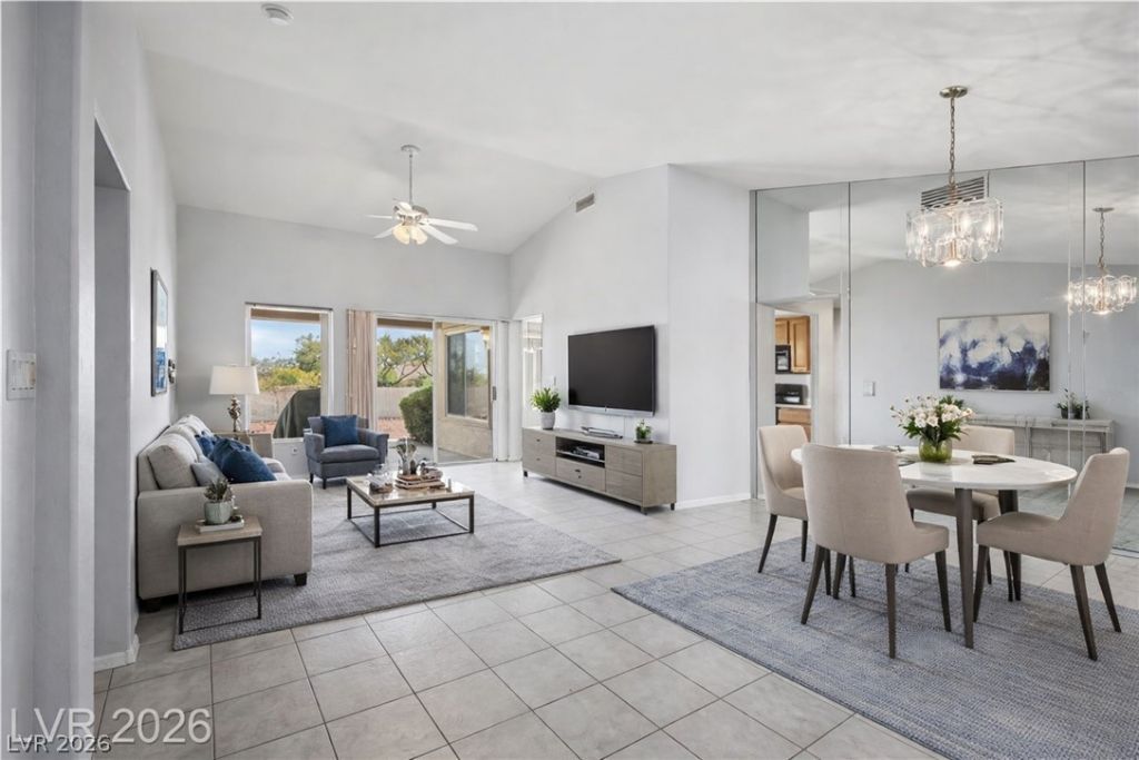 Stunning VIEW Property in Sun City Summerlin! Private, large elevated lot with no rear neighbors. Highly desired Reno Model floorplan! Spacious open living & dining room. VAULTED CEILINGS in living area and bedrooms! Tile and carpet. Sun filled kitchen that includes a charming nook with a bay window. Primary suite is separate from guest quarters. Configured as 2 bedrooms & an office so you can work at home or on your hobbies. 2 car attached garage with built in storage and golf cart pad. Plumbed for H20 conditioner. ALL APPLIANCES included. Bay windows in bedrooms. Formal DR that could be office/extra seating/library. Enjoy resort style 55+ living! Golf, tennis, multiple indoor/outdoor pools, fitness centers, 3 golf courses, clubs, activity centers, pickleball & more. Be as busy as you want to be or enjoy the privacy of your home. Conveniently located near shopping/dining/freeways & more! Original Owner! Step outside to your large covered patio & backyard & enjoy privacy & views.