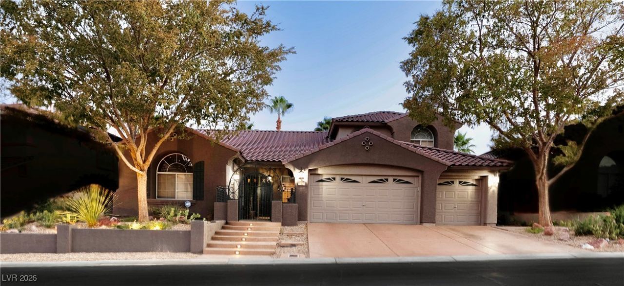 Incredible Price Adjustment for your home in a sought-after Summerlin community w/unparalled Toll Brothers Style. Front courtyard w/fountain, 8' dbl front doors, a large foyer w/a formal dining room & formal living room. Main level has a den w/separate entrance for office space/guest room, an oversized primary suite w/backyard access & spacious ensuite bath w/2 vanities, makeup table, claw-foot tub, marble tiled shower & custom closet. Upgrades thru-out w/coffered ceilings, electric window shades, NEW PAINT AND CARPET w/beautiful hardwood floors. Stunning kitchen w/granite countertops, island w/vegetable sink, double ovens, cooktop, walk-in pantry & custom cabinets. Enjoy an open family room w/cozy fireplace & access to a backyard oasis perfect for entertaining, a large covered patio, separate electric patio cover, sparkling heated pool & spa & custom wrought iron accents. Upstairs is a large loft (easily converted to 4th bedroom), a guest suite w/ensuite bath, 3rd bedroom & full bath