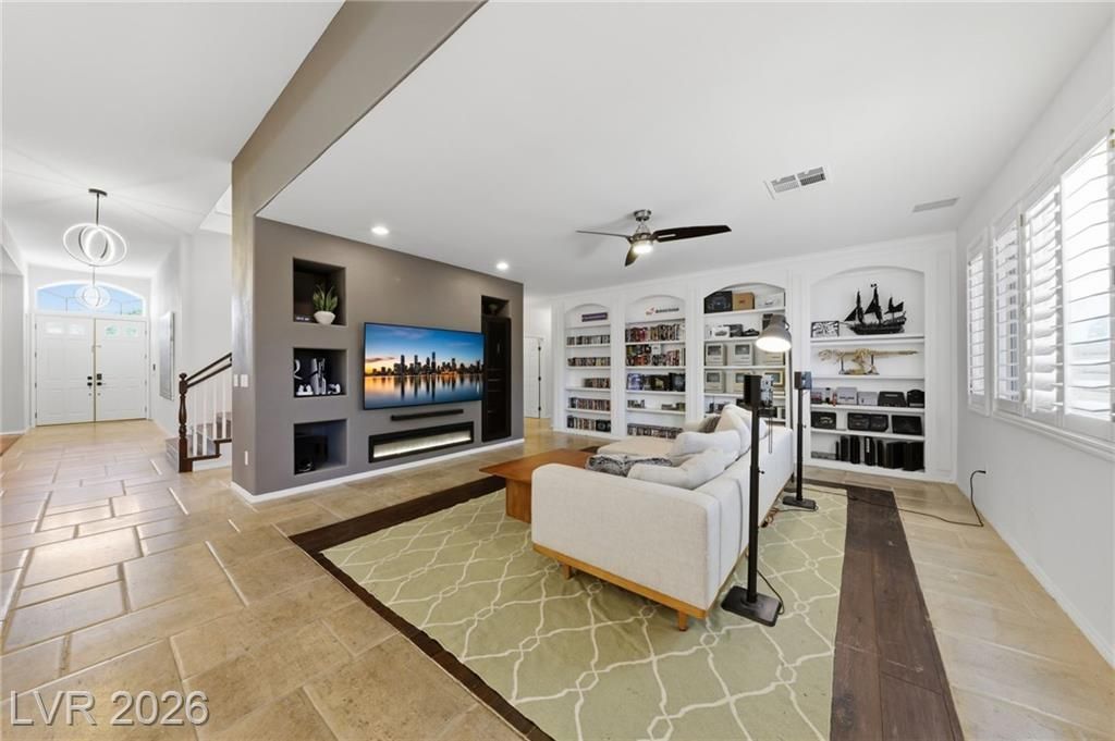 Welcome to this luxurious home located within the prestigious gated Woodlands community in North Summerlin. This beautifully upgraded 3,166 sq ft home offers the perfect blend of style, comfort, and prime location?just minutes from Tivoli Village, Boca Park, Downtown Summerlin, and convenient access to the 215 and Summerlin Pkwy. An inviting entry opens to an expansive living room featuring wood and stone flooring and a stylish staircase.The open-concept design flows into a large updated kitchen with quartz counters, a spacious island that overlooks the stunning family room with a modern electric fireplace and custom bookshelf wall. The well-designed layout offers 4 bedrooms, including a downstairs Jr. Suite?perfect for guests, office or multi-gen living. Upstairs features a spacious primary suite, with two addl bedrooms sharing a recently remodeled Jack & Jill bath.The backyard includes a covered patio, built-in BBQ, & a large spa.Two new HVAC units complete this exceptional home.