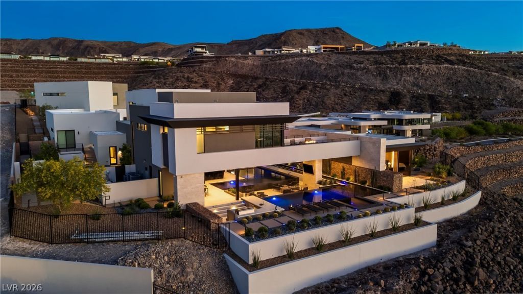 Can you imagine living in a Stunning Home at the Top of the Dragon's Reserve in the highly sought-after Dragons Ridge in MacDonald Highlands? This Extraordinary Masterpiece is One of a Kind! With Stunning Panoramic Views of the Las Vegas Strip, Mountain Range, City of Las Vegas, one may truly enjoy living with peace, and tranquility. Explore the amazing details of this design and its unique features. This home has 5 bedrooms, with private baths, a Kitchen and Prep area for the pickiest of chefs overlooking the Great Room, 3 Fireplaces, a lower 6 Car garage, an upper garage for an RV / Boat / Trailers or 6 more cars. The backyard is an entertainer's paradise with multiple pools, outdoor BBQ, 2 private Sky Decks, 4 Fire Pit Sitting Areas, a pool bath, and heated sunken sitting area. A must-see Media Room & Game Room, Outdoor Bar, Zen Garden and a 2 Story Waterfall. Notice the true indoor/outdoor living. This home is equipped with the latest home technology. Please click the Video Link!
