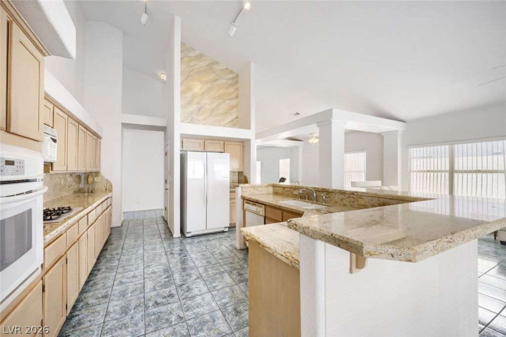 Beautiful single story home with a 3-car garage located in a desirable Henderson community with no HOA. This property offers an open and spacious floor plan with vaulted ceilings and abundant natural light throughout. The kitchen and main living areas flow seamlessly, creating an inviting space for everyday living and entertaining. The backyard is designed for year round enjoyment with a sparkling swimming pool, relaxing spa, and a covered patio area perfect for outdoor dining or lounging in the shade. The primary bedroom suite is a standout feature, offering a private retreat area with a second closet that can be used as a flex space A two sided gas fireplace sits between the bedroom and bathroom, adding warmth and ambiance to both spaces. The primary bath includes generous counter space, a soaking tub, and a walk in closet.