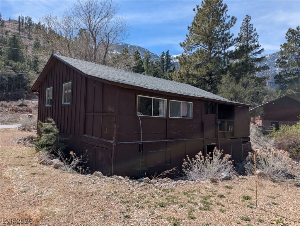 The cabin sits tucked beneath a stand of tall, whispering pines on the slopes of Mount Charleston, its weathered wood siding has stood the test of time of the mountain sun and winter snow. Edged by wild grasses and, opening into a surprisingly large lot that feels both private and full of possibility. The structure itself has good bones but clearly needs some TLC. There's a rustic charm here that can't be replicated?just uncovered and restored. It's easy to picture a garden, a fire pit, or even an expanded deck taking shape. With a little vision and effort, the property could transform into a quiet mountain retreat or a cozy full-time escape from the city below.