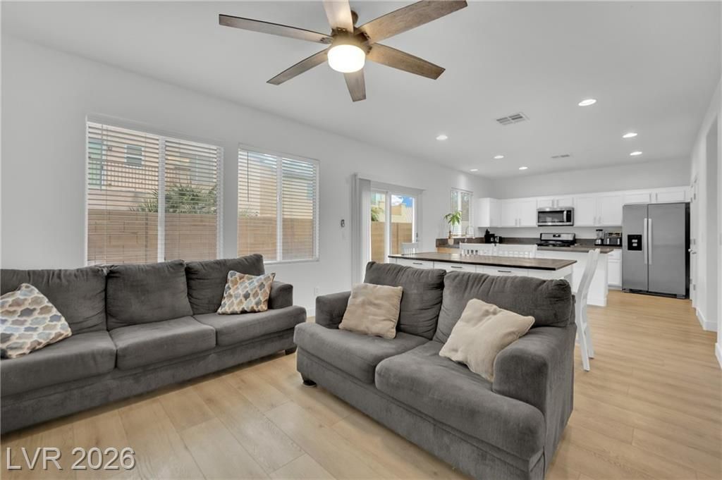 Beautiful Las Vegas home with HUGE loft & upgrades including NEW A/C (2024), NEW flooring, Fresh Paint, New Carpet, NEW water heater, & NEW Andersen sliding door with ENERGY EFFICIENT DUAL PANE WINDOWS. Located on a quiet cul-de-sac in Sunrise Ridge! This 3 bedroom home features an open floor plan with formal living room & large family room?perfect for living & entertaining. Kitchen includes stainless steel appliances, island, breakfast bar, pantry, and ample cabinet space. Upstairs offers a massive loft?ideal for second living room, office, or game room. Spacious primary suite with walk-in closet, dual sinks, tub & separate shower. Private backyard with patio. Smart thermostat, app-controlled garage, and alarm system ready. Near parks, dog parks, shopping, dining, freeway, and Wetlands Park with nearby hiking trails. Well-maintained home ready is ready for you!