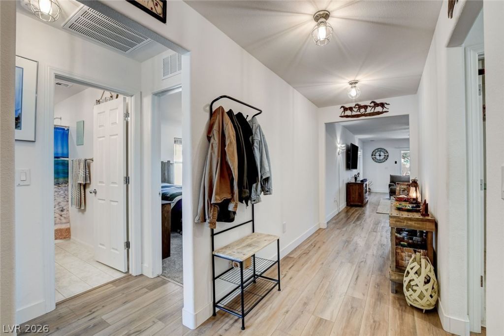 Beautifully updated 4-bedroom, 2-bath home in the country community of Solaris at Indian Springs. This open-concept floor plan features upgraded luxury wood laminate flooring, custom designer lighting and custom wood blinds throughout. The kitchen, with additional recessed lighting, provides upgraded quartz countertops, breakfast bar, enhanced sink, custom backsplash, and smart appliances including a WiFi-enabled stove and low-decibel dishwasher. Also find along find a separate dining area. WiFi garage door opener adds convenience. All bedrooms generously sized, one with walk-in closet. The primary en-suite offers a separate garden tub and shower. Enjoy the private backyard with covered patio, ceiling fan, pergola, and mature plum tree. Can't miss the mountain view! Country-style community living just 30 minutes from skiing, world class golf, shopping, and Las Vegas. Convenient to Creech AFB, enjoy the peaceful setting of this home!