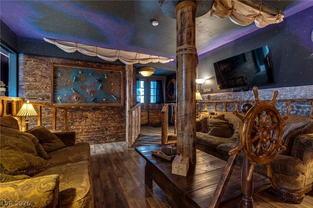A truly one-of-a-kind home that brings creativity and fun to life! This vibrant residence sets the tone for a unique interior filled with custom pirate-themed spaces. Step inside and be transported into an imaginative world?enjoy a ship-inspired living area with ocean murals and nautical details, and an entertainment space designed as a lively pirate tavern with a ship-shaped bar, karaoke stage, disco lighting, and artistic finishes. A separate-entry living suite includes a loft bed, sunken lounge, kitchenette, and private bath?perfect for added privacy. The backyard features a covered patio with a swim spa and hot tub. Ideal for entertaining or enjoying a playful, character-filled retreat.