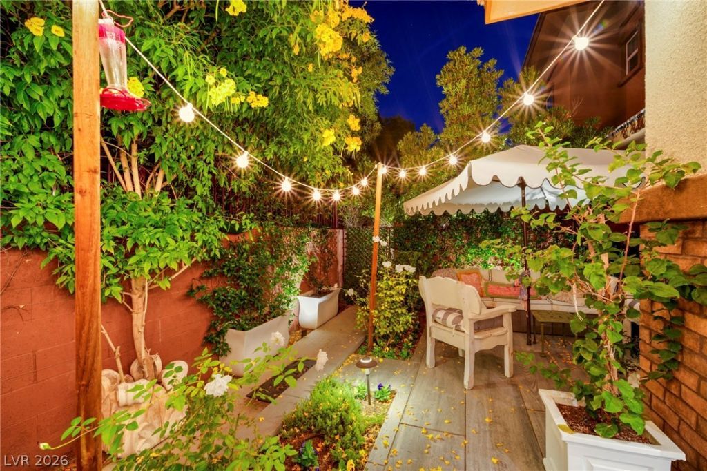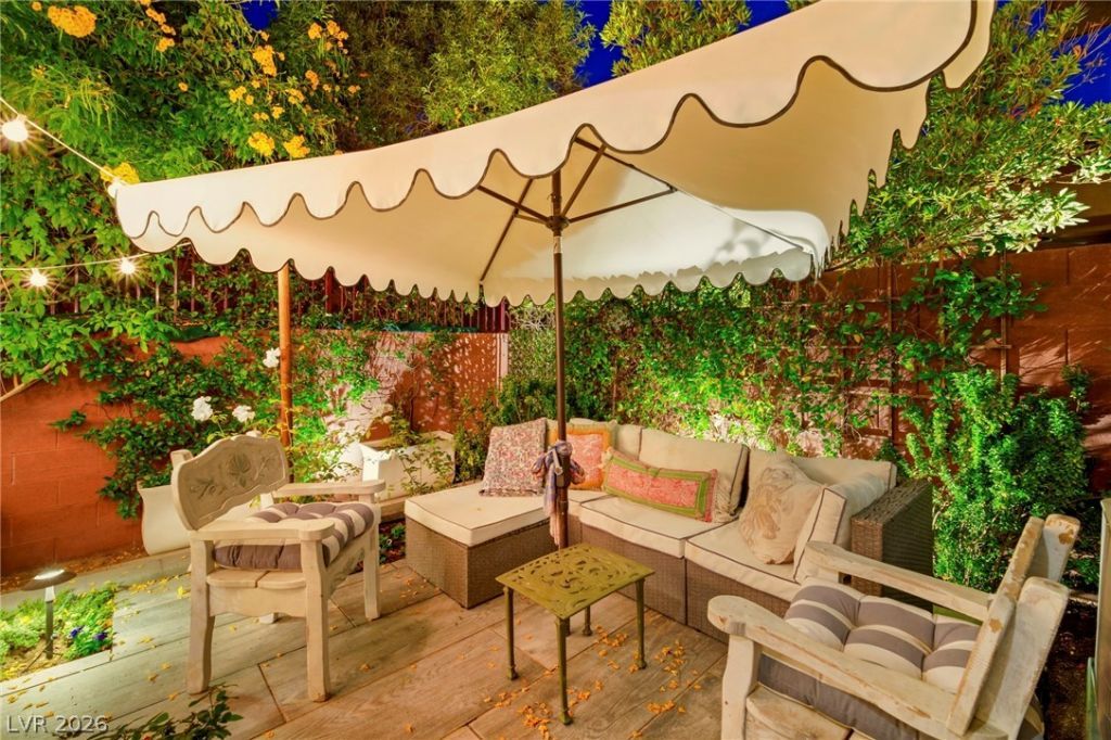 Classic styling and turnkey finishes define this well-appointed pied-Ã -terre located in Summerlin South. The interior features balanced natural light, custom crown and base moldings, & hardwood-style flooring. The kitchen features quartz countertops, custom cabinetry, stainless-steel appliances, & a custom-built-in walk-in pantry. The primary suite offers a comfortable layout with a walk-in closet & an ensuite bath with marble-style surfaces & an oversized shower. A secondary room provides flexibility for guests, work, or additional storage needs. The third bedroom is finished with custom built-ins & a desk. All closets are fully custom outfitted. Custom three-panel sliding doors lead to a lush, private patio suitable for outdoor seating, dining, or quiet relaxation. Additional features include upgraded shutters, electrical and lighting, Brizio and Delta plumbing fixtures, and custom vanities. This gated community features a clubhouse and gym with a spacious pool and cabana area.