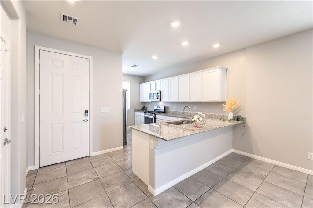 Beautifully maintained single-story home in the gated community of Altair Pointe at Valley Vista, ideally located with convenient access to the I-215 and just minutes from Costco, Aliante Golf Club, Aliante Casino, and Galaxy Park. This thoughtfully designed single-level home features an open-concept layout with white cabinetry, granite countertops, and stainless-steel appliances, seamlessly connecting the kitchen to the spacious living area?perfect for everyday living and entertaining. Enjoy tile flooring throughout with no carpet, offering a clean, modern look and easy maintenance. The entire home, including the garage, has been freshly painted, giving it a bright and refreshed feel. The pool-sized backyard features a covered patio, pavers, and low-maintenance turf?perfect for outdoor living. Additional highlights include epoxy garage flooring and a Kinetico water softener. Move-in ready and designed for comfortable, low-maintenance living in a highly desirable gated community.