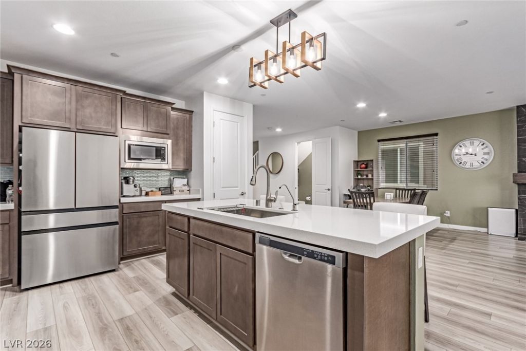 Your dream home is here! This stunning 5-bedroom residence welcomes you with a 2-car garage, tasteful stone accents, and a front patio that sets an inviting tone. You'll be delighted by the spacious great room with a soothing palette, attractive wood-look flooring, blinds, and an inviting fireplace for intimate moments. The well-appointed kitchen comes with quartz counters, wood shaker cabinets with crown moulding, a tile backsplash, recessed lighting, SS appliances, a pantry, and an island with a breakfast bar for casual meals. Upstairs, you'll find a versatile loft perfect for setting up an office or a relaxing lounge. The primary bedroom includes soft carpeting, an ensuite with dual sinks, and a convenient walk-in closet. Spend cozy evenings in the charming backyard, complete with a covered patio, stylish pavers, and pristine artificial turf for outdoor activities. Don't miss out on this fantastic opportunity!