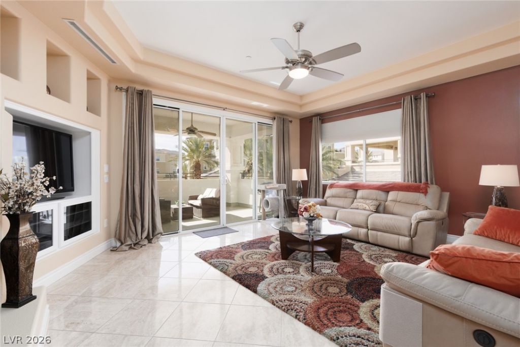 PRICED $250,000 BELOW BUILDER OFFERINGS! Located just minutes from TPC Las Vegas, Tivoli Village, and Downtown Summerlin. A luxury single-level mid-rise residence offers privacy, security, and convenience. Gated entry with private elevator access and a rare oversized 2-car garage. Resort-style amenities include a lagoon pool, cabanas, five spas, barbecue pavilions, a fitness center, and an elegant clubhouse lounge. This Third-floor unit features two bedrooms plus a flexible den (currently used as a dining room), a spacious great room with a fireplace, & access to an expansive 265 sq ft terrace ideal for relaxing or entertaining. The kitchen offers granite countertops, stainless steel appliances, double convection ovens, a gas cooktop, a breakfast bar, and a built-in workstation. Indoor laundry room included. A generous primary suite features a spa-style bath with a separate soaking tub, a walk-in shower, and ample closet space. An exceptional lock-and-leave opportunity in Summerlin.